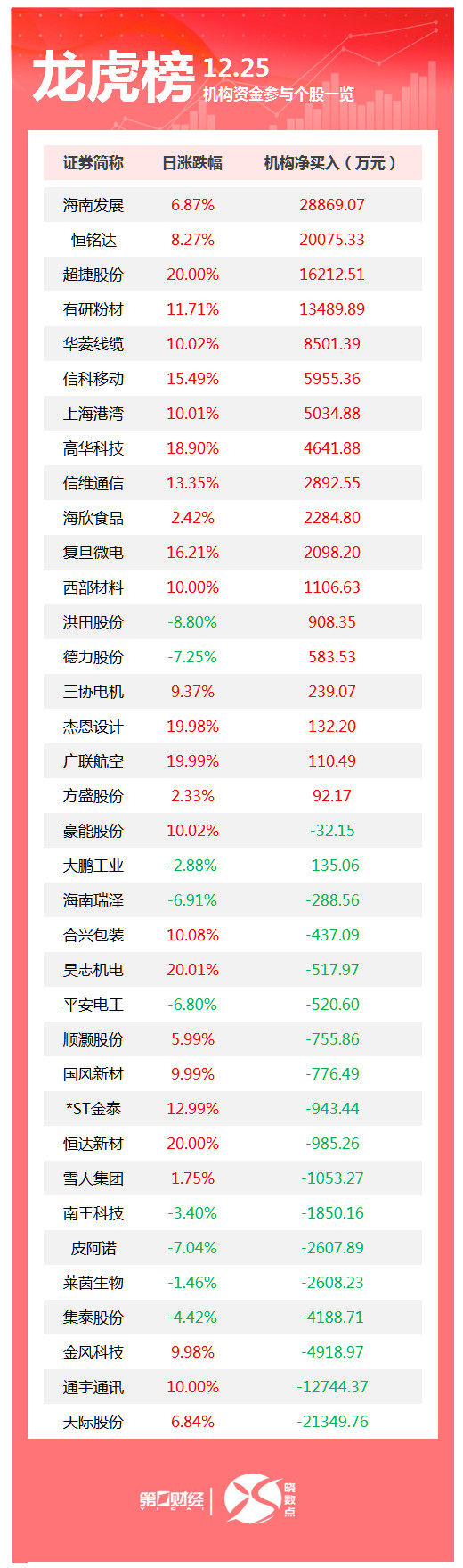 当天机构净买入前三的股票分别是海南发展、恒铭达、超捷股份,净买入金额分别是2.89亿元、2.01亿元、1.62亿元。